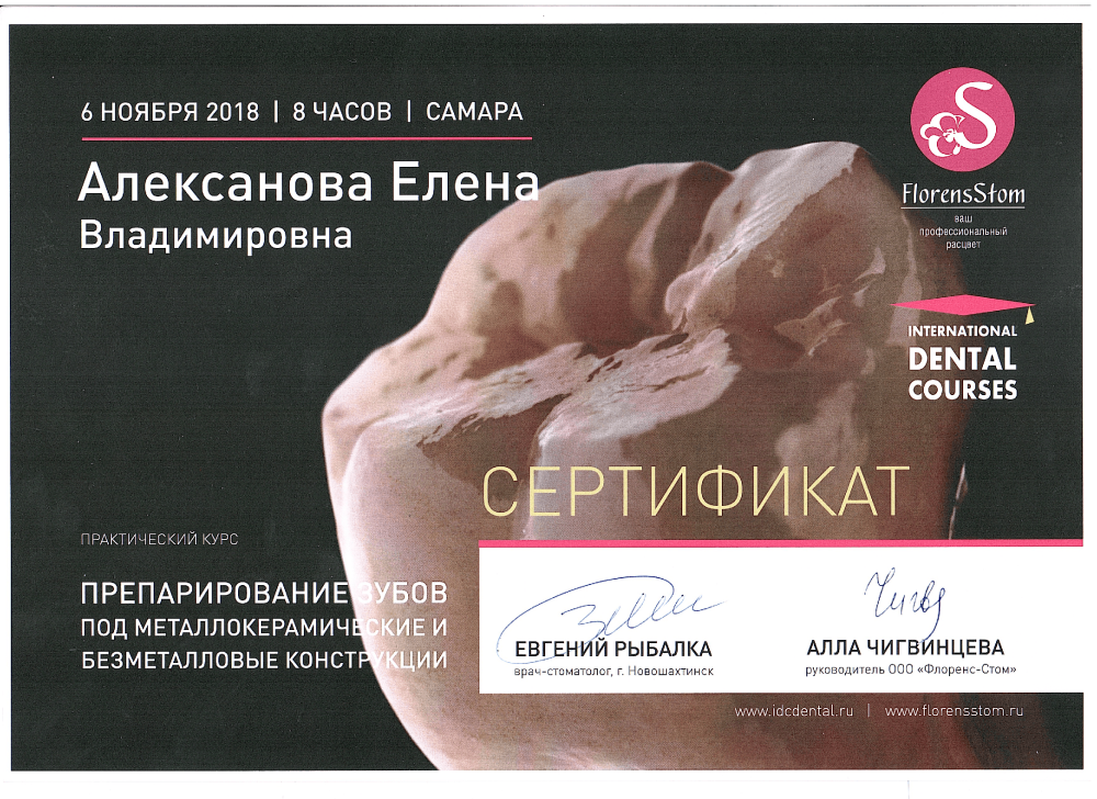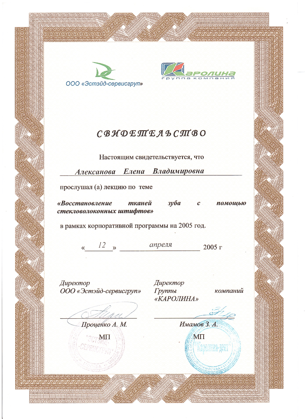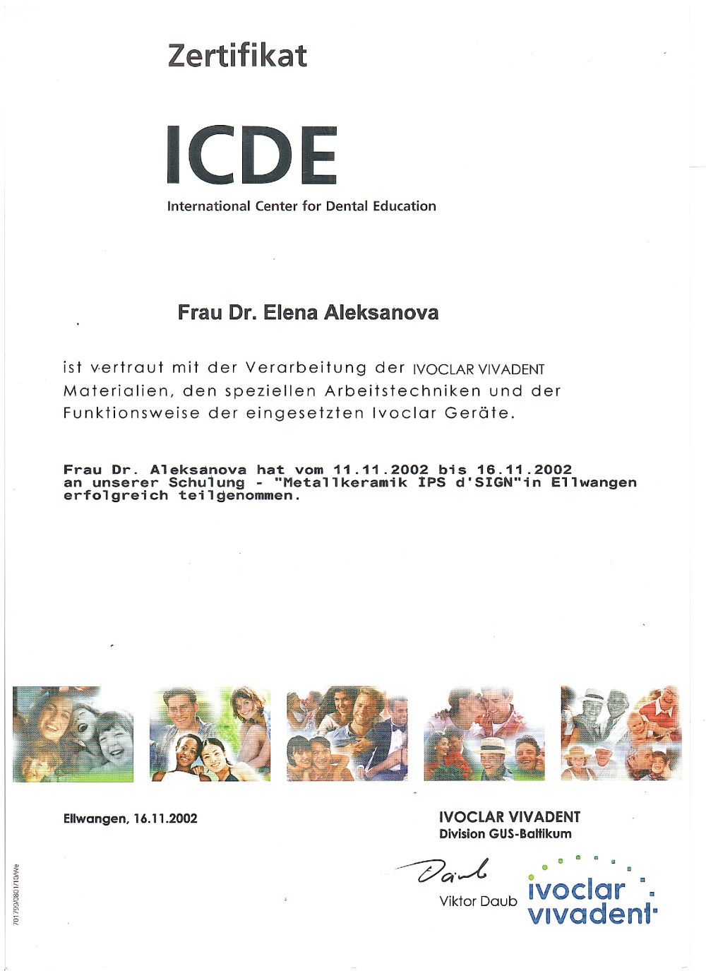 Ноябрь 2002 - Сертификат “Metallokeramik IPS de SIGN(IVOCLAR VIVADENT)”.
