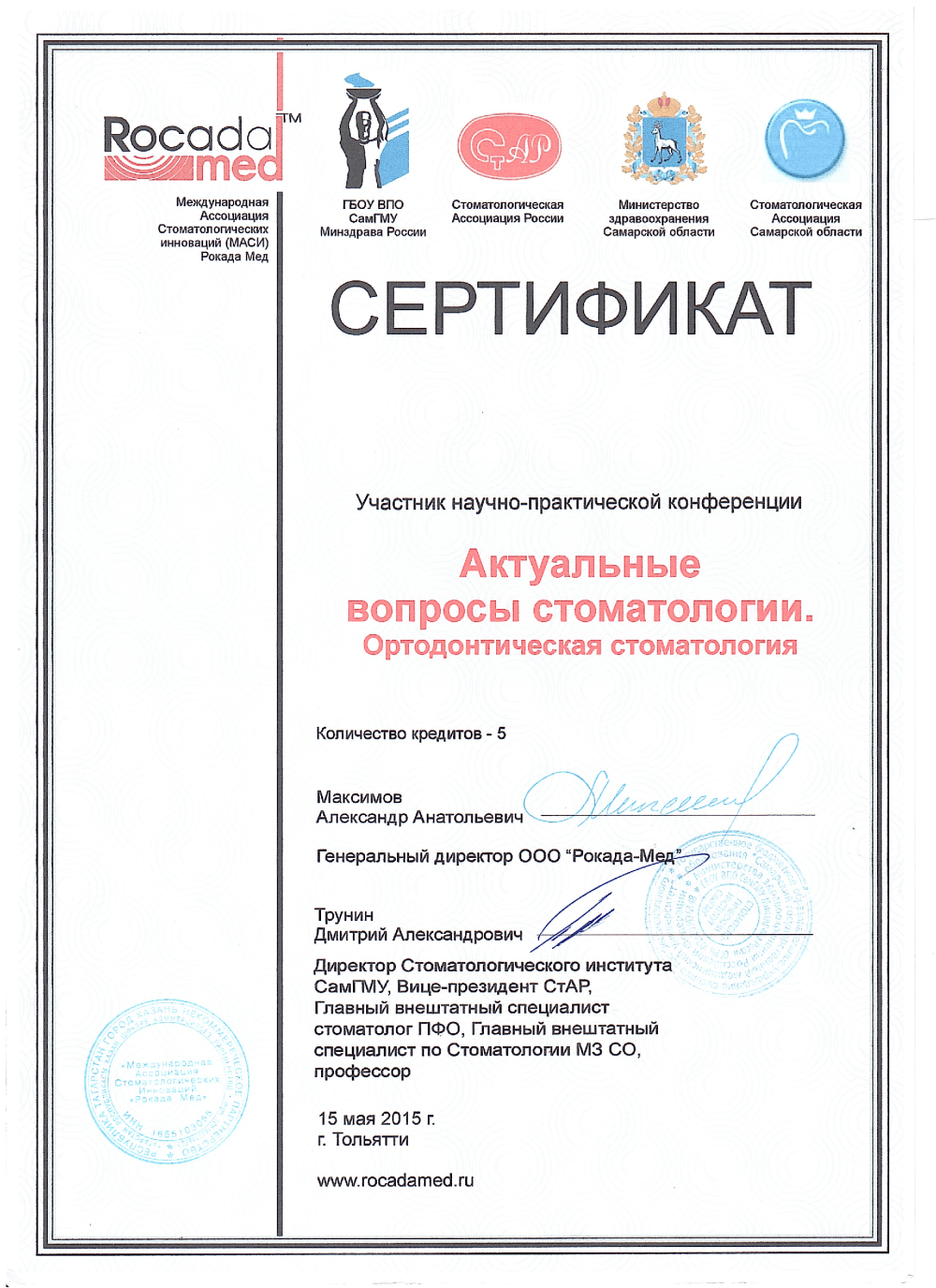 Май 2015 — Сертификат «Актуальные вопросы стоматологии. Ортодонтическая стоматология».