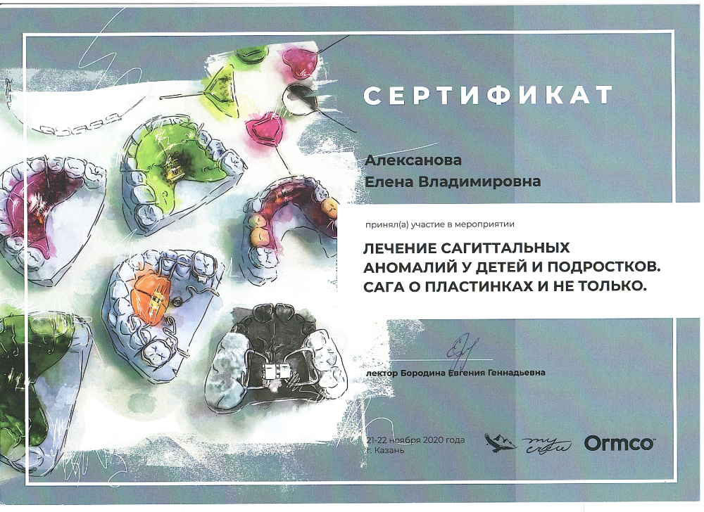 Ноябрь 2020 - Сертификат «Лечение сагиттальных аномалий у детей и подростков. Сага о пластинках и не только».