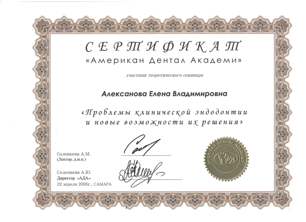 Апрель 2006 - Сертификат «Проблемы клинической эндодонтии и новые возможности их решения».