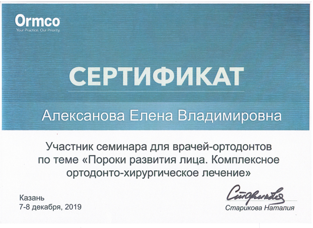 Декабрь 2019 - Сертификат «Пороки развития лица. Комплексное ортодонто — хирургическое лечение».