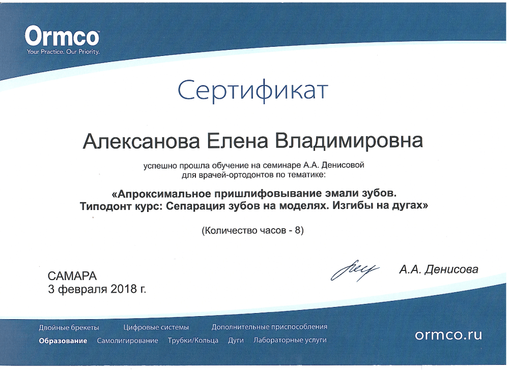 Февраль 2018 - Сертификат «Апроксимальное прошлифовывание эмали зубов. Типодонт курс — Сепарация зубов на моделях. Изгибы на дугах».