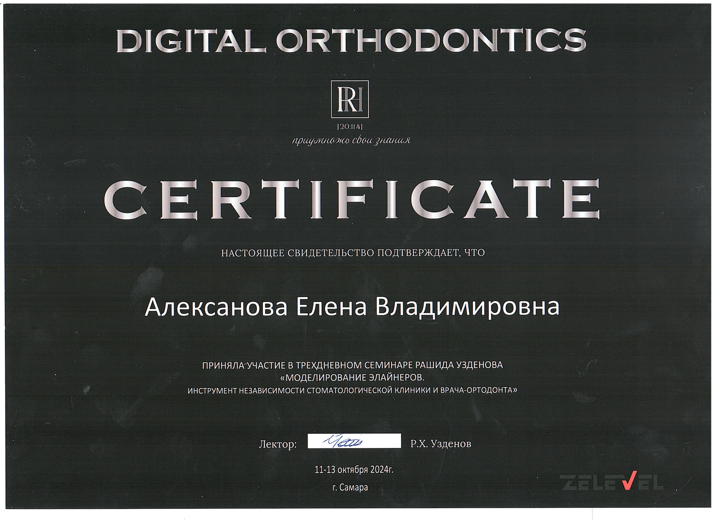 Октябрь 2024 — Сертификат «Моделирование элайнеров. Инструмент независимости стоматологической клиники и врача—ортодонта».