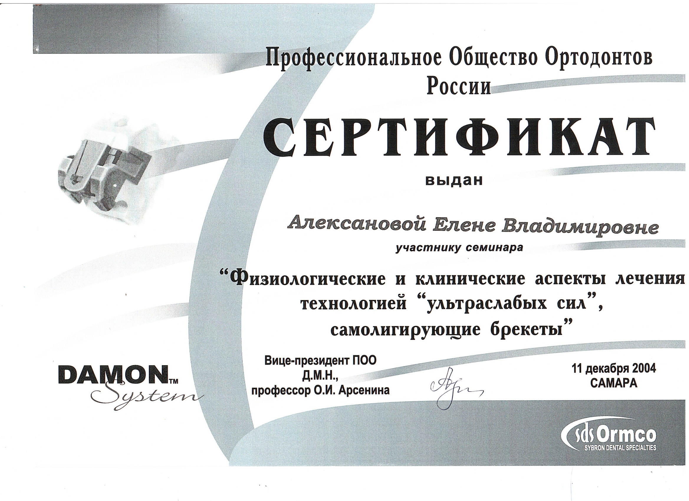 Декабрь 2004 - Сертификат «Физиологические и клинические аспекты лечения технологией ультраслабых сил, самолигирующие брекеты».