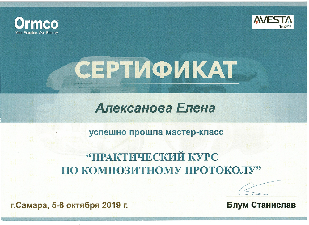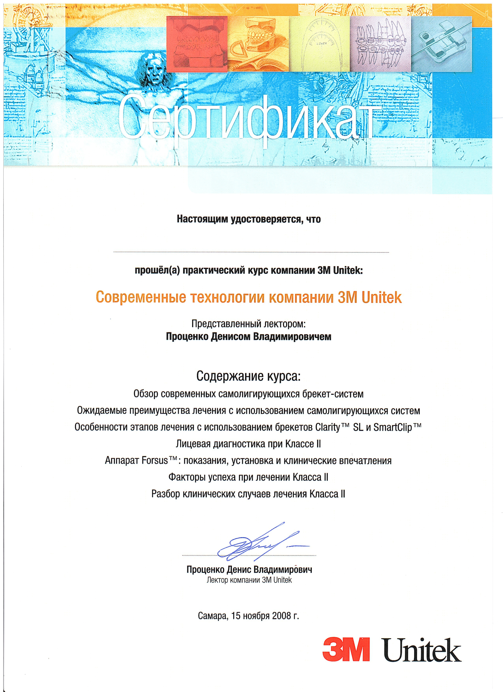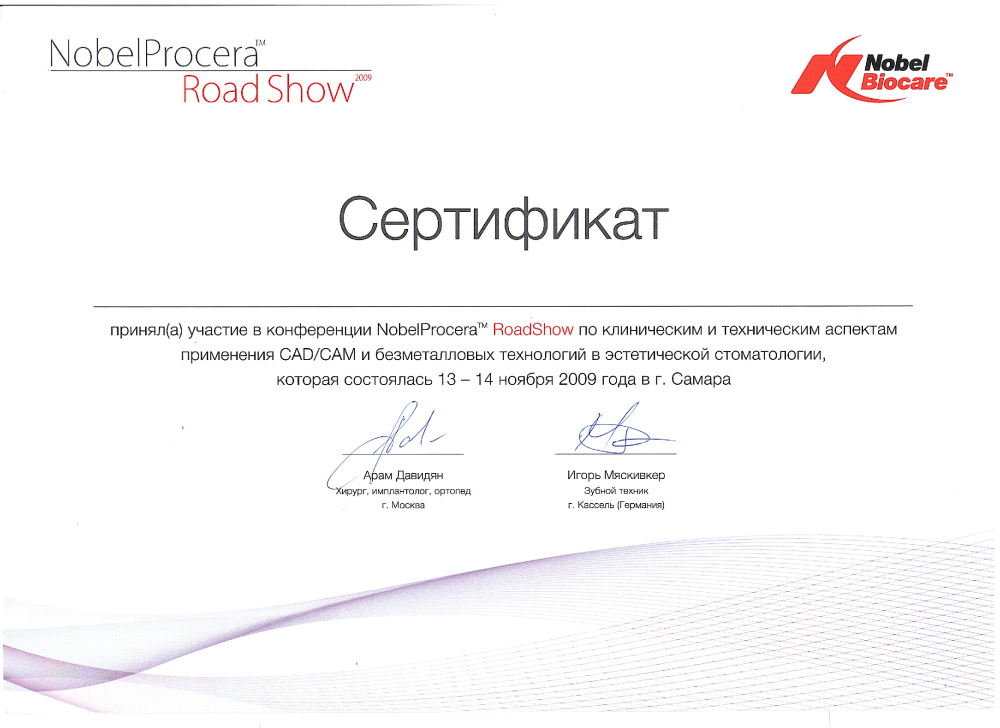 Ноябрь 2009 — Сертификат «Клинические и технические аспекты применения CAD-CAM и безметалловых технологий в эстетической стоматологии».