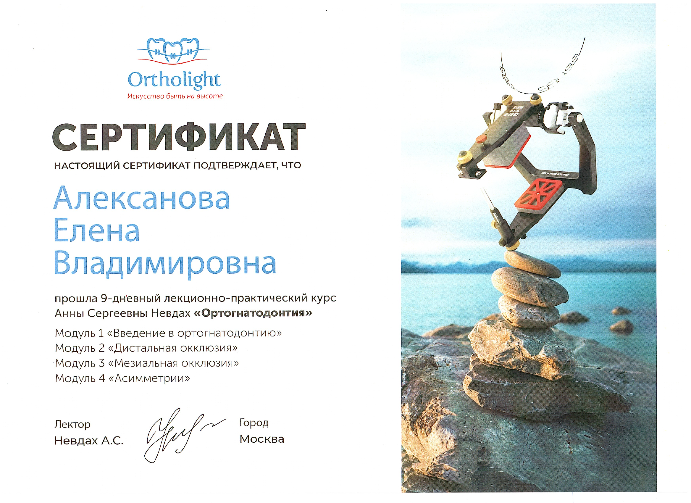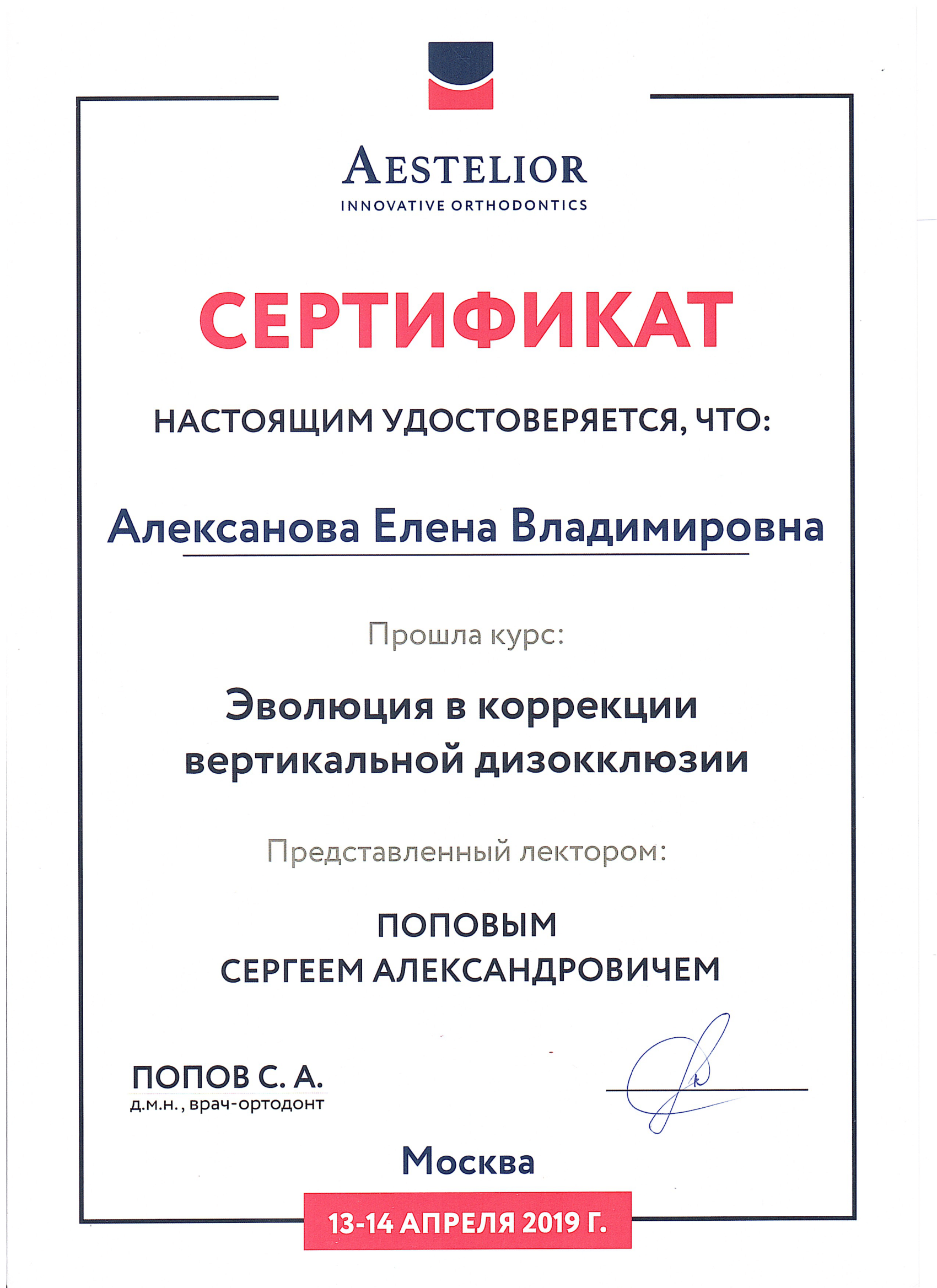 Апрель 2019 - Сертификат «Эволюция в коррекции вертикальной дизокклюзии».