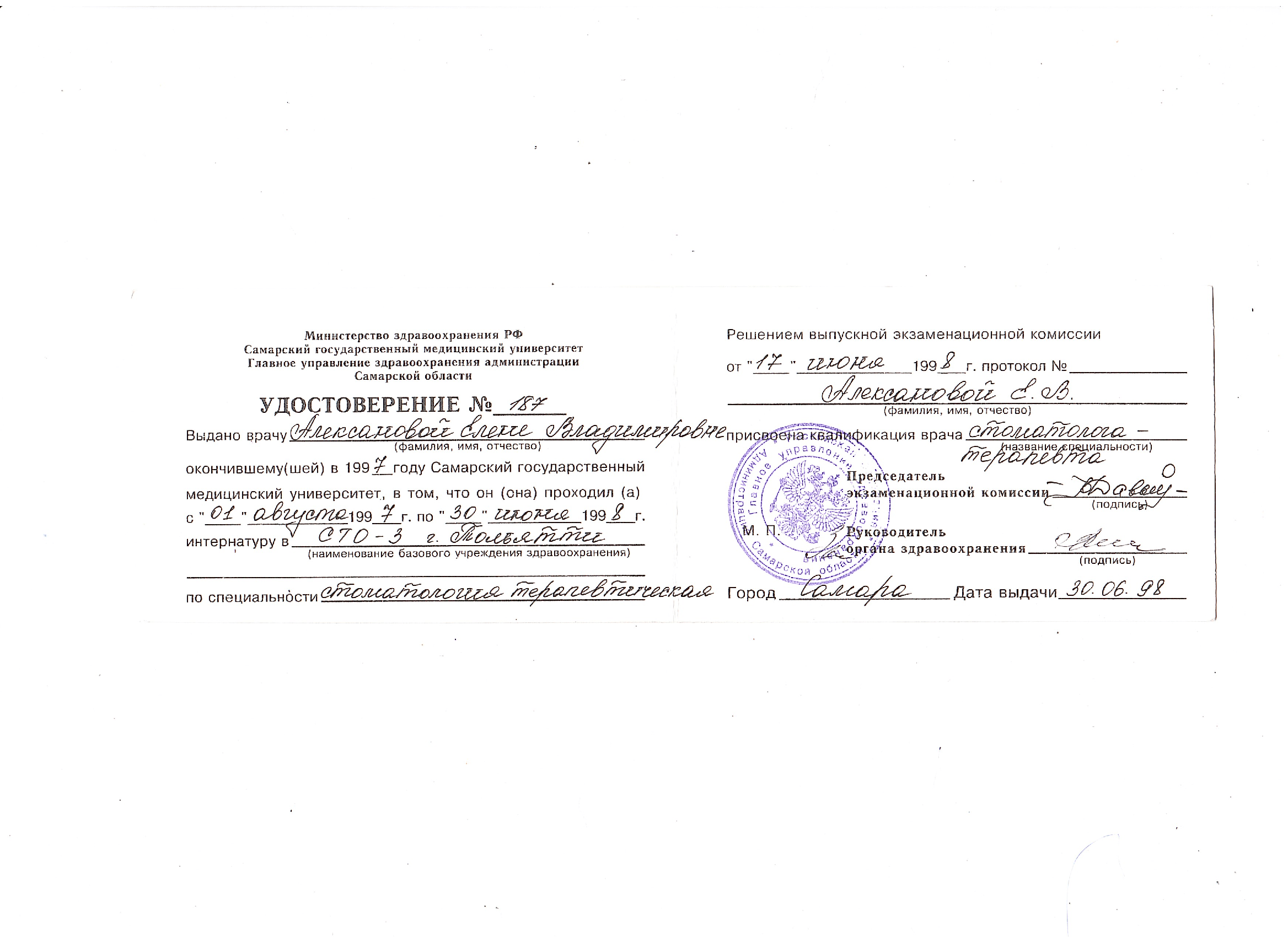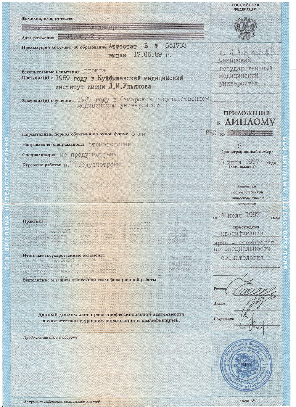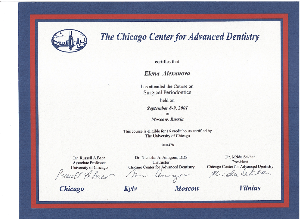 Сентябрь 2001 — Сертификат «Course on Surgical Periodontics”.