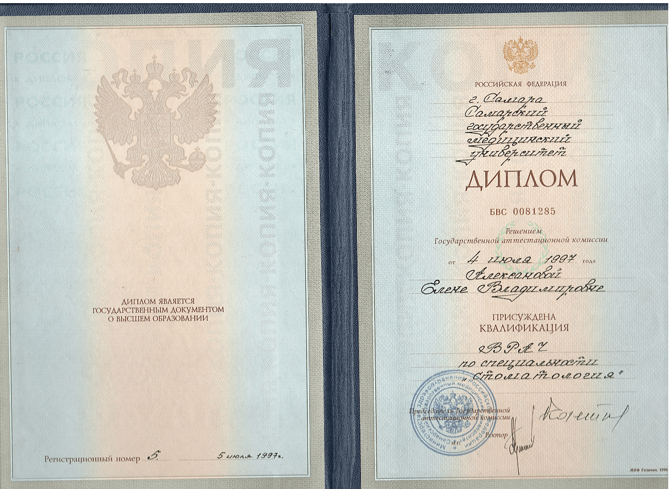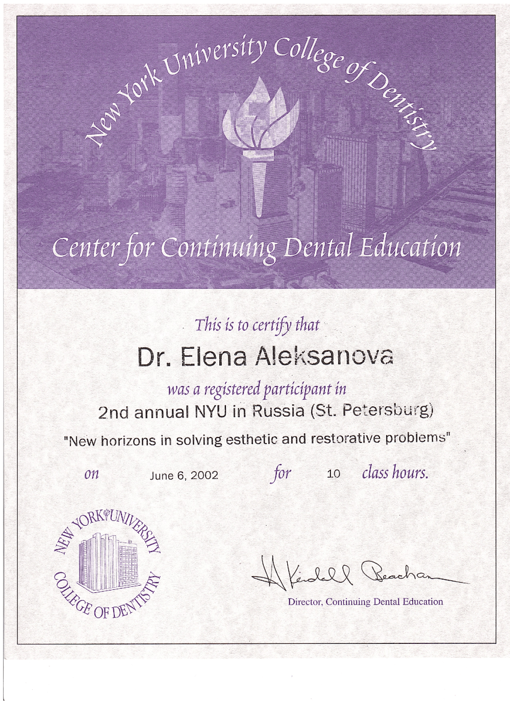 Июнь 2002 — Сертификат «NEW horizons in solving esthetic and restorative problems”.