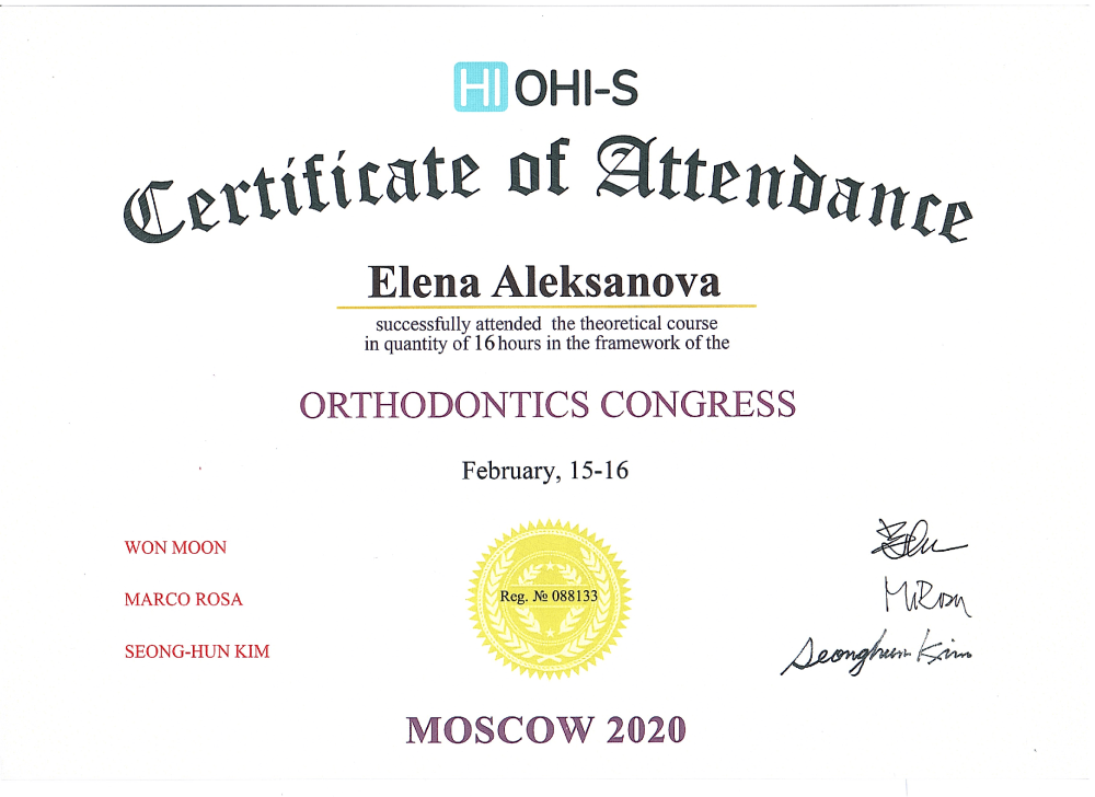 Февраль 2020 — Сертификат участника ORTHODONTICS Congress(Международный ортодонтический конгресс).