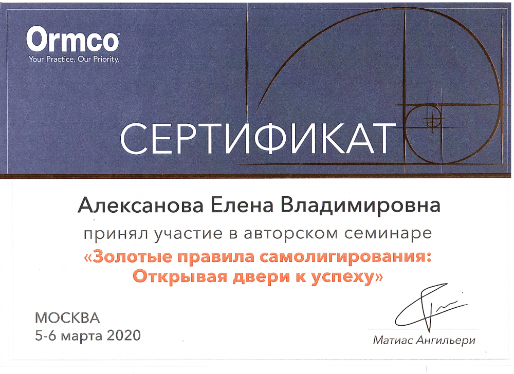Март 2020 - Сертификат «Золотые правила самолигирования. Открывая двери к успеху».