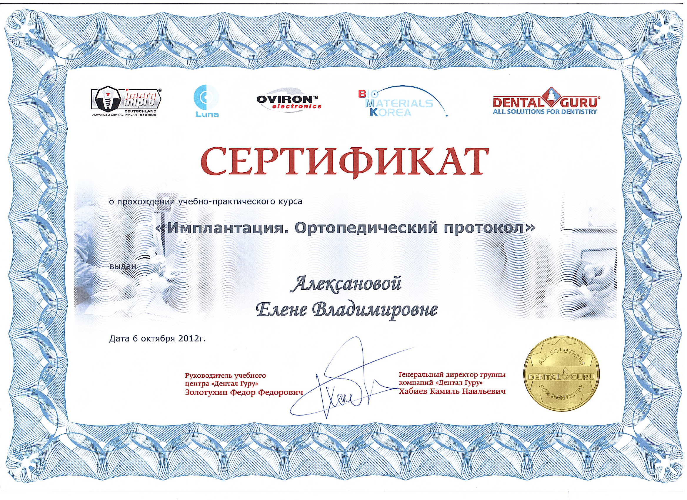 Октябрь 2012 - Сертификат «Имплантация. Ортопедический протокол».