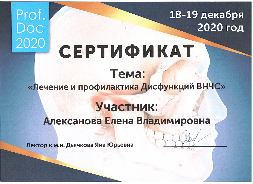 Декабрь 2020 - Сертификат «Лечение и профилактика дисфункций ВНЧС»