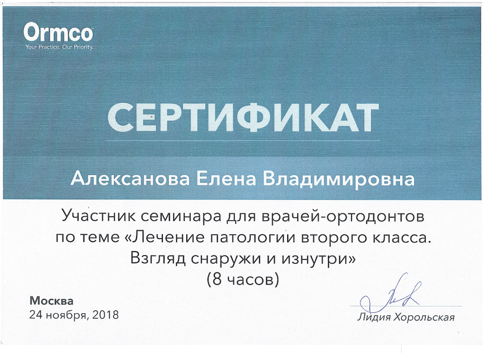 Ноябрь 2018 - Сертификат «Лечение патологий второго класса. Взгляд снаружи и изнутри».