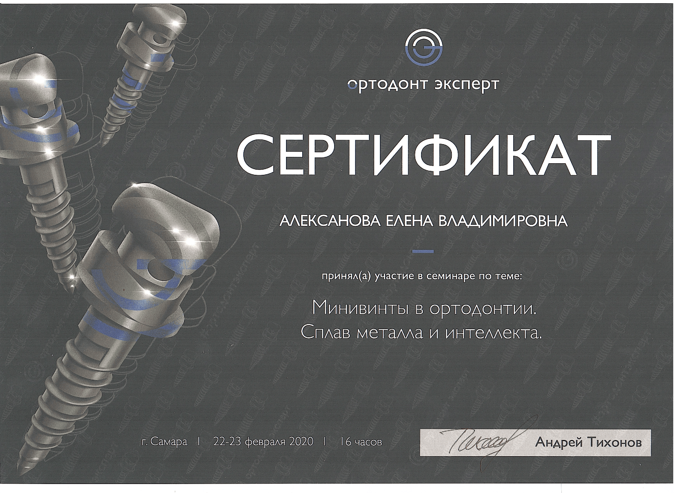 Февраль 2020 - Сертификат «Минивинты в ортодонтии. Сплав металла и интеллекта».