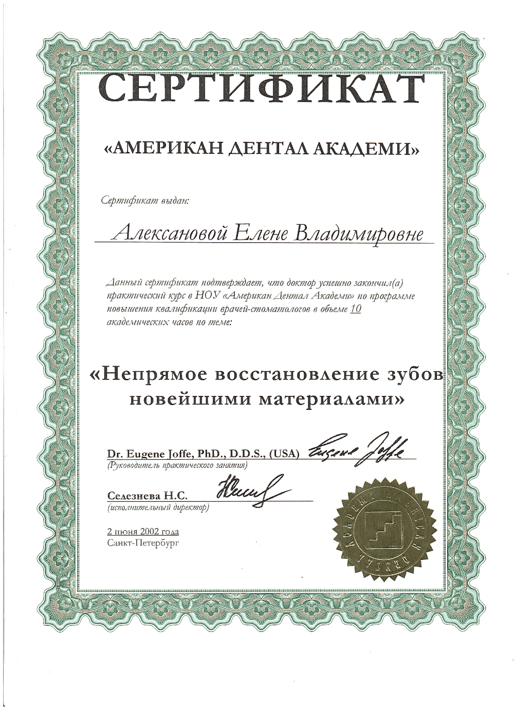 Июнь 2002 - Сертификат «Непрямое восстановление зубов новейшими материалами»