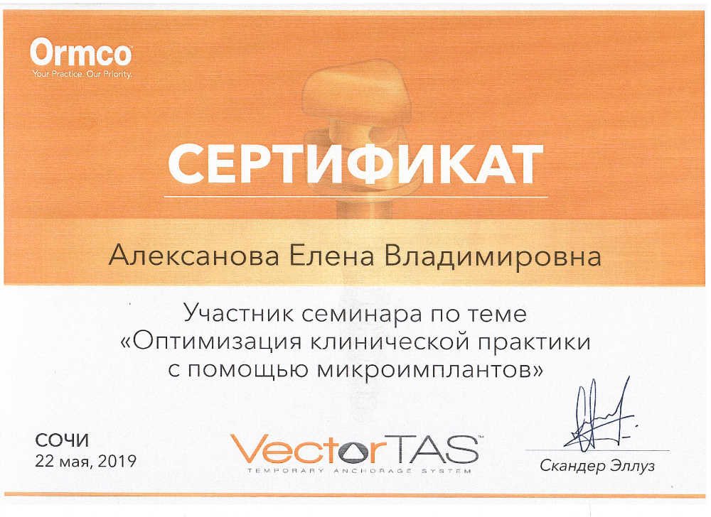 Май 2019 - Сертификат « Оптимизация клинической практики с помощью микроимплантов»