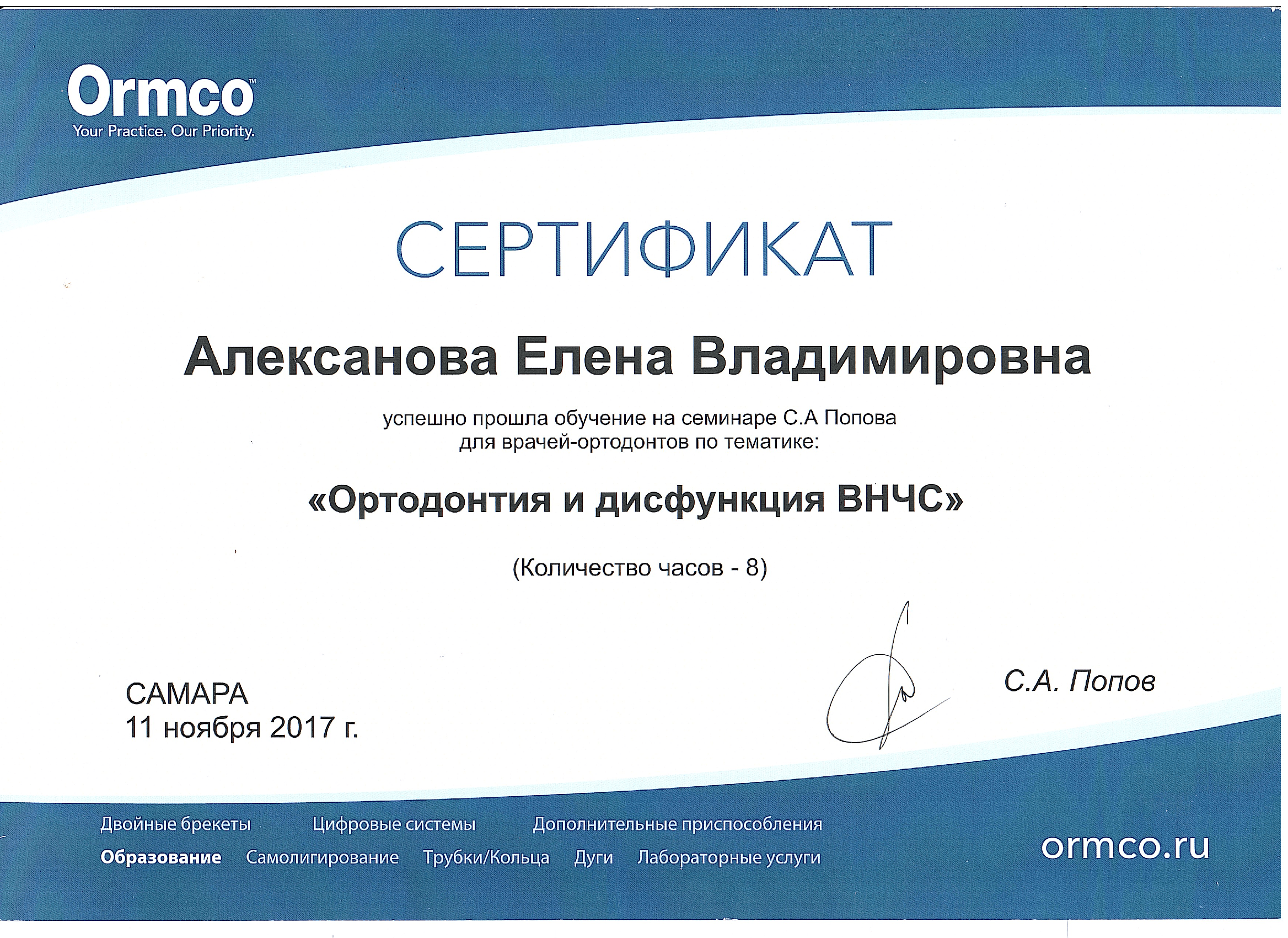 Ноябрь 2017 - Сертификат «Ортодонтия и дисфункция ВНЧС»