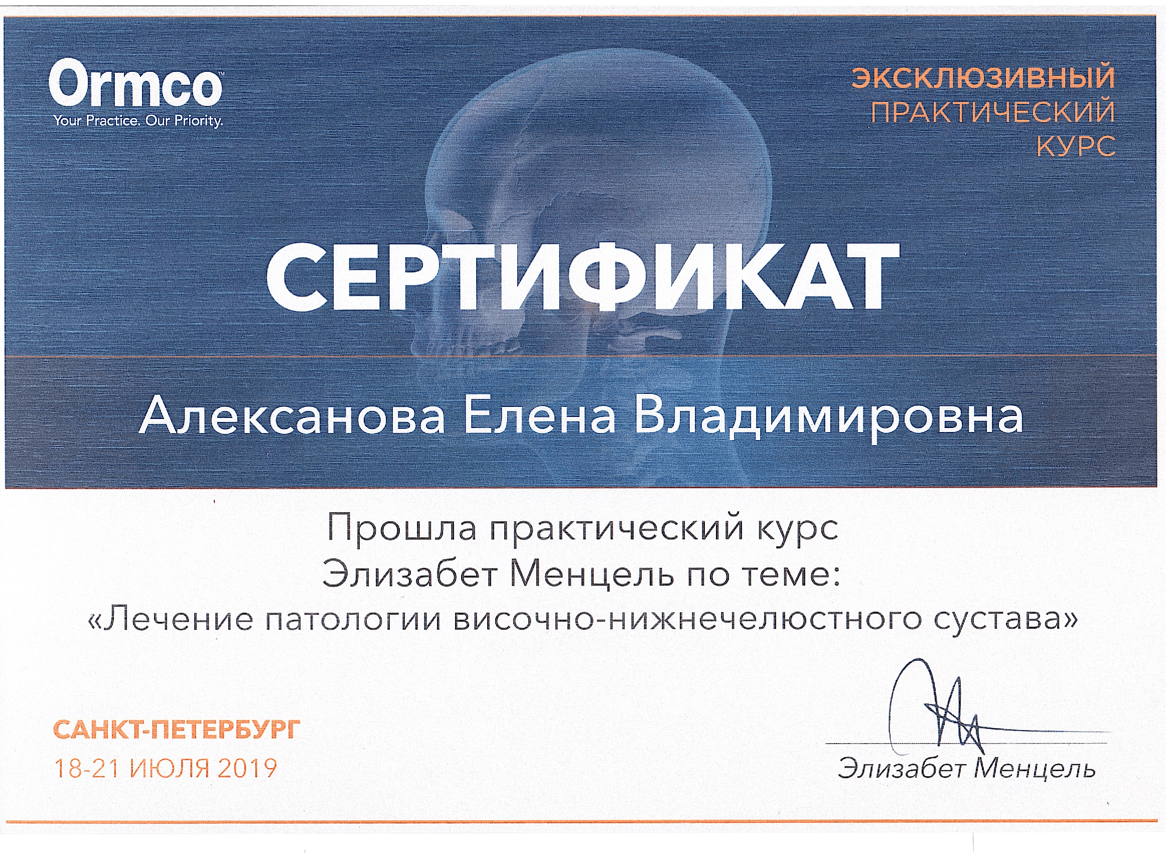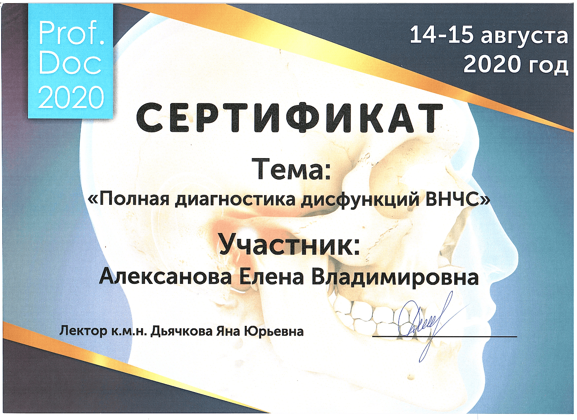 Август 2020 - Сертификат «Полная диагностика дисфункций ВНЧС».