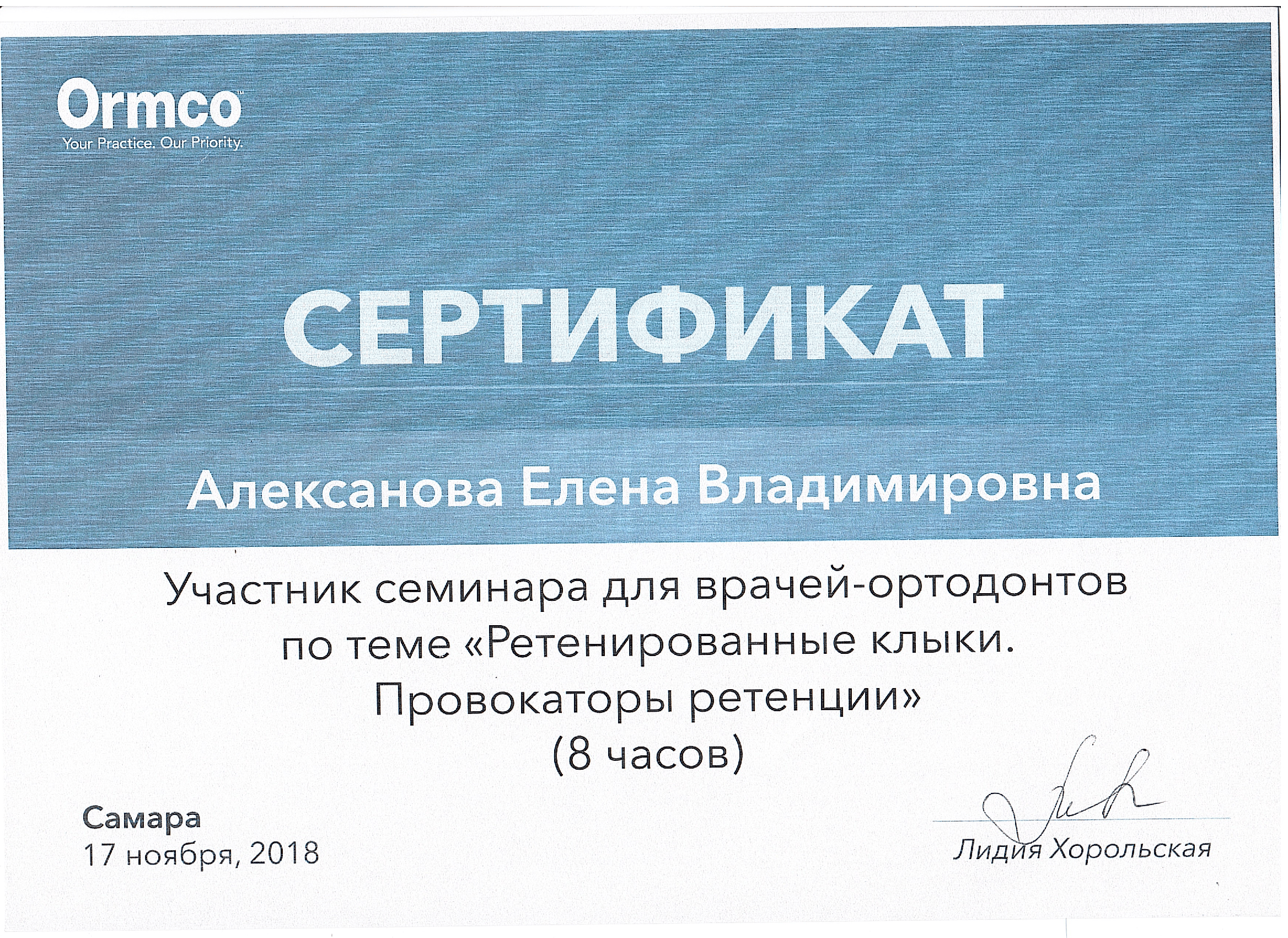 Ноябрь 2018 - Сертификат «Ретинированные клыки. Провокаторы ретенции».
