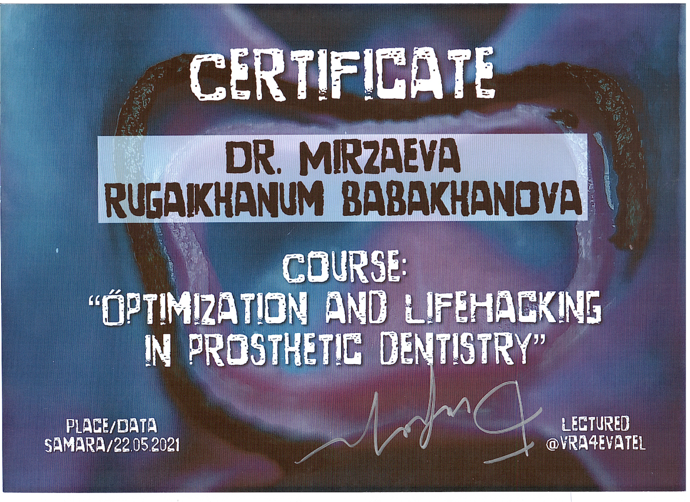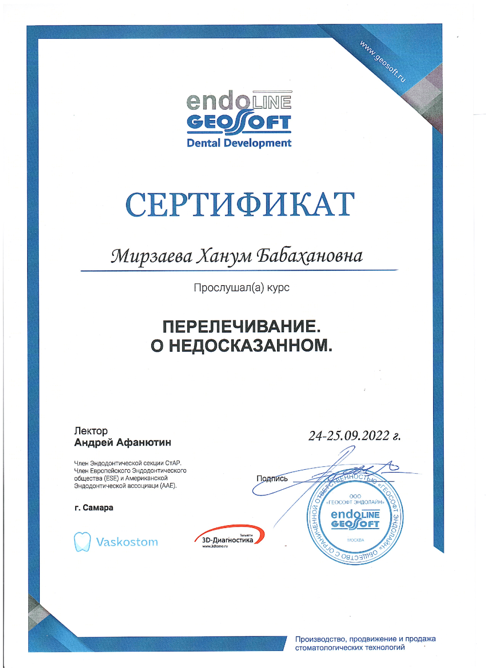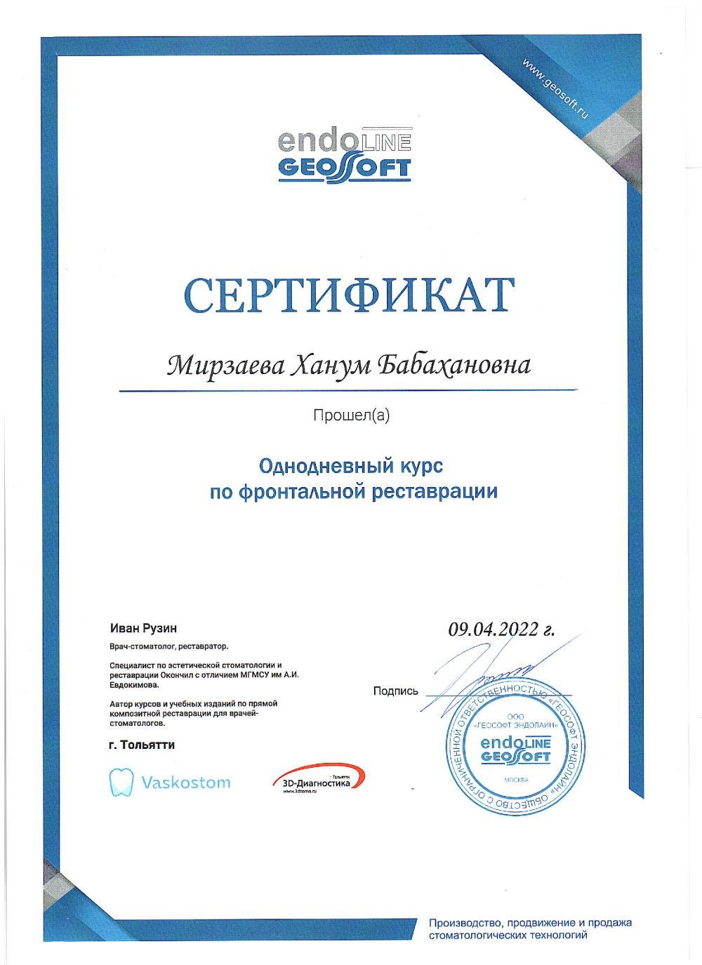 Ханум специализируется на реставрации, художественной реставрации, эндодонтическом лечении каналов зубов, в том числе с использованием микроскопа и пломбировании горячей гуттаперчей. Ханна выполняет несъемное протезирование из диоксида циркония и emax с использованием интраорального сканера. Достигает блестящих результатов в частичном и полном съемном протезировании.. Ханум постоянно совершенствует профессиональные навыки. В работе инициативна, активно применяет полученные знания, используя современные технологии. Ханум следит за новинками отрасли, изучает клинические исследования.