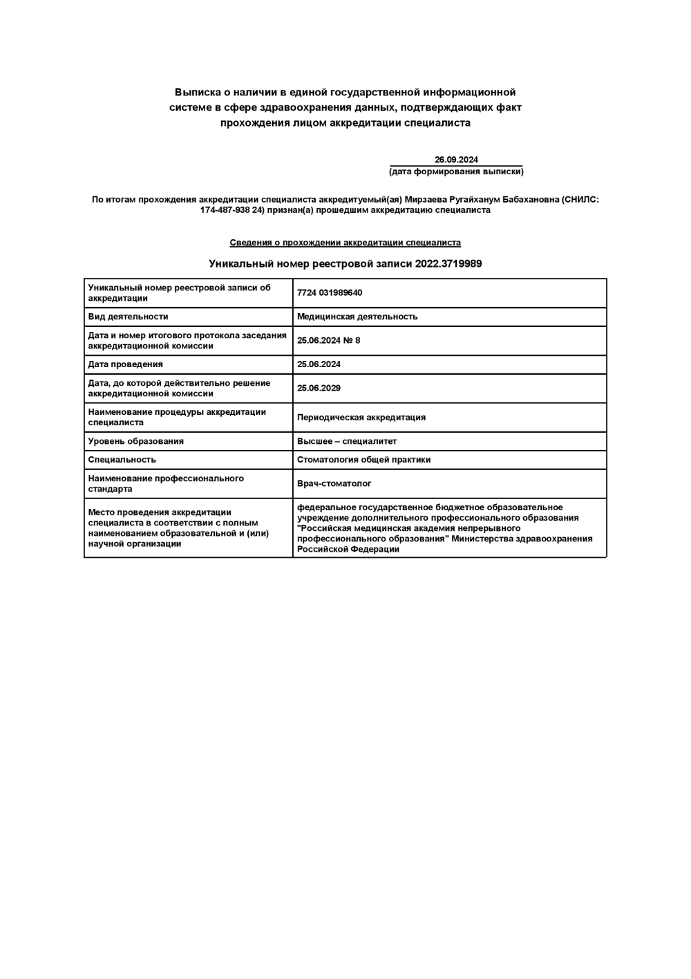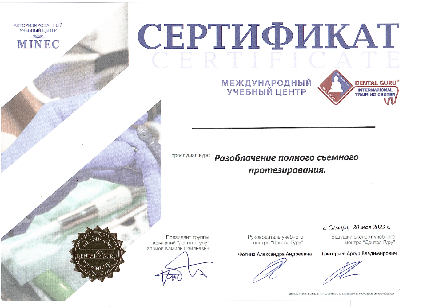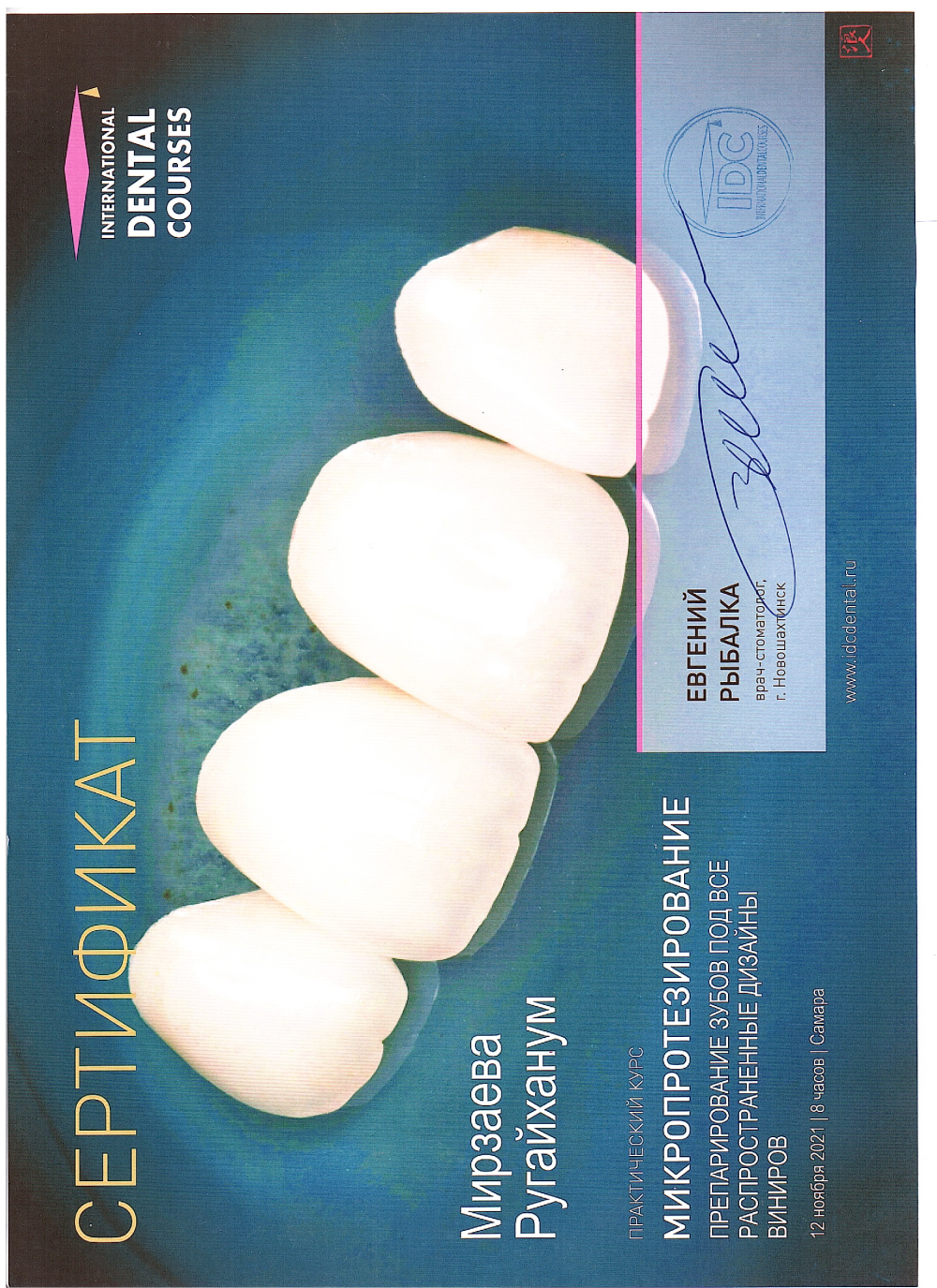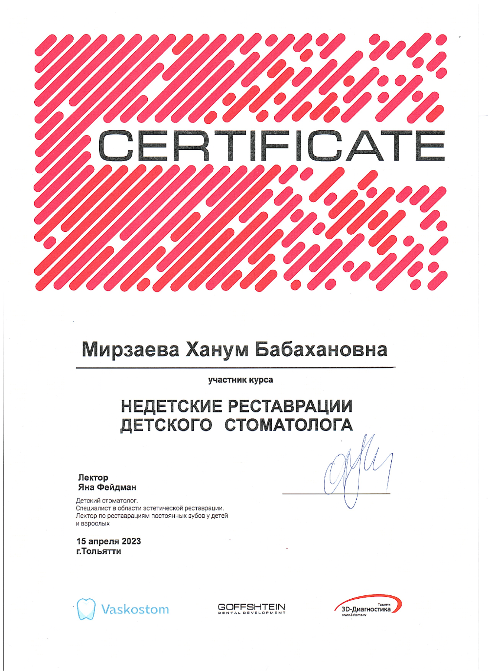 Ханум специализируется на реставрации, художественной реставрации, эндодонтическом лечении каналов зубов, в том числе с использованием микроскопа и пломбировании горячей гуттаперчей. Ханна выполняет несъемное протезирование из диоксида циркония и emax с использованием интраорального сканера. Достигает блестящих результатов в частичном и полном съемном протезировании.. Ханум постоянно совершенствует профессиональные навыки. В работе инициативна, активно применяет полученные знания, используя современные технологии. Ханум следит за новинками отрасли, изучает клинические исследования.